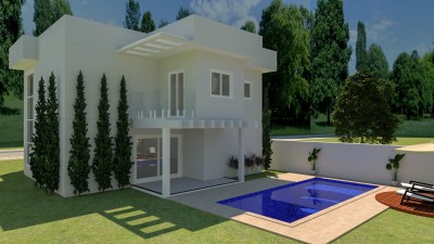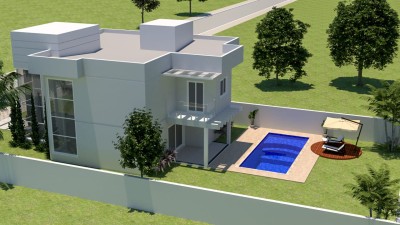 A casa conta com aberturas em alumínio e vidro, proporcionando iluminação natural e uma vista agradável para o exterior. Além disso, possui um terreno murado, paisagismo e uma piscina, ideal para momentos de lazer e relaxamento.